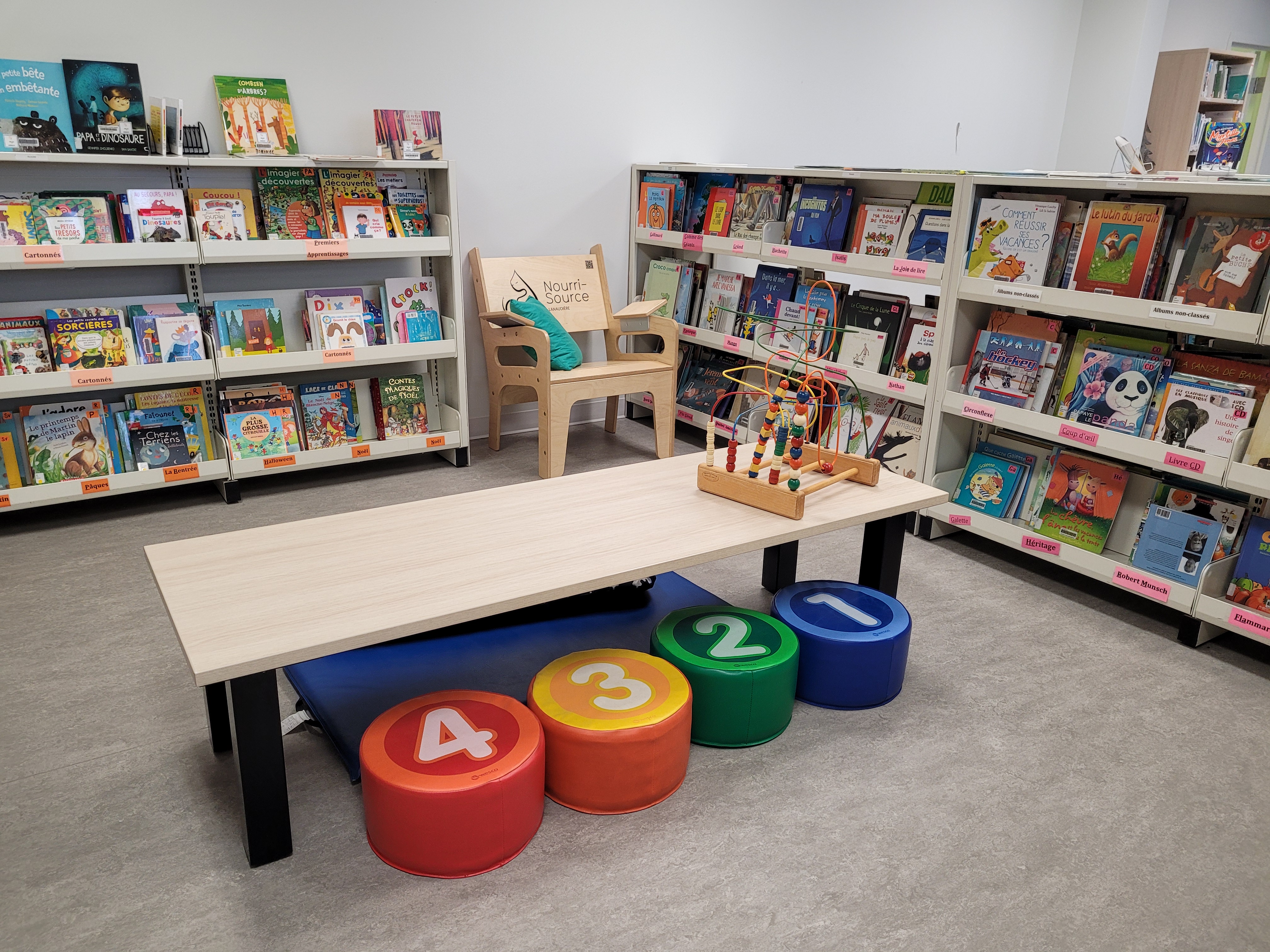 Un coin dédié à la petite enfance est mis à la disposition des familles lanoroises. Cet aménagement ludique offre un moment de détente aux jeunes enfants, permettant ainsi aux parents de profiter pleinement de leur passage en à la bibliothèque.